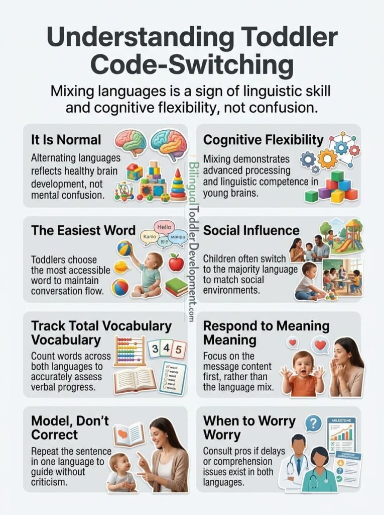 Most bilingual toddlers code switch at least sometimes. It is especially normal when your child has strong comprehension, steady growth in new words, and clear social engagement.