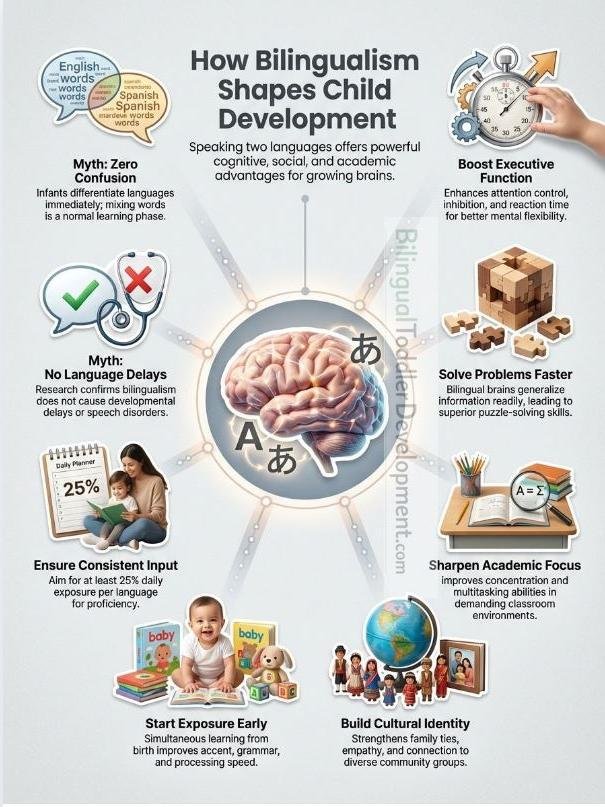 Being bilingual can support child development, especially social communication and flexible language learning, when your child gets consistent opportunities to use both languages.